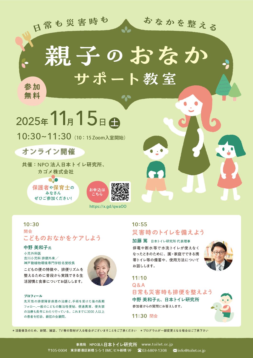 こどもの排便の専門医である中野美和子氏から子どもの排便と便秘の対策について、当団体からは家庭や園でできる災害時のトイレの備えについてお伝えします。